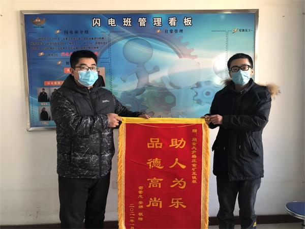 本以为这是一件不足挂齿小事,王俊程也没放在心上。过了有半个月左右,姜大姐的亲属找到矿上并送来一面绣有“助人为乐、品德高尚”的锦旗。原来,那天晚上王俊程走后,姜大姐才想起没有留下好心人的电话号码和单位,但是隐约间记起车内有一件招金工作服。后经在招金矿业上班的亲属帮忙分析车辆驶来的方向和车牌,然后多方托人打听就找到了王俊程的单位。所以姜大姐连忙做好锦旗送到了大尹格庄金矿,找到了这位雪夜中的招金好心人。