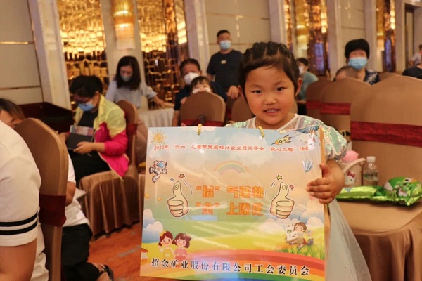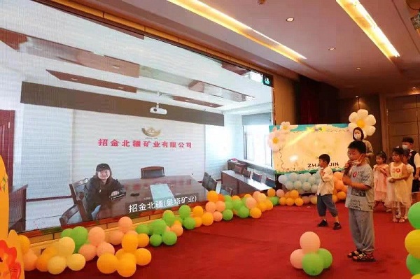 活动开始后,孩子们在家长的带领下,来到由招金标识形状形成的心愿墙前,将提前准备好,自己亲手写下的最想对父母说的话贴在心愿墙上,表达对父母的感恩和思念之情;在舞台中央,工作人员已提前将视频连线投放至大屏幕上,孩子们可以通过大屏幕与千里之外的父母视频通话,他们有的与父母说着心里话,有的向父母展示着自己的朗诵、舞蹈、唱歌、绘画等诸多才艺,用自己的方式向埠外的父母展示着自己的成长和进步,其中一位孩子与埠外的父亲连线时说到:“爸爸,我已经是一个小男子汉了,已经学会照顾自己和帮妈妈做家务,爸爸在外地安心工作,家中有我,请您放心”。待孩子们尽兴玩耍后,孩子们来到礼品台,接过由公司工会按照各年龄段儿童需要及喜好,分别为他们精心挑选的文具套装、马克笔、水壶、泡泡机等礼品组成的“大礼包”。“大礼包”内既有学习用品,又有儿童玩具,礼物虽然普通,但却十分暖心,大家都知道,这其实也是一份不平常的礼物,因为它承载着一份浓浓的爱。孩子们在收到节日礼物后,个个展露出开心的笑脸,屏幕内外的家长和工作人员也感受到了孩子的幸福和快乐,弥补了埠外职工在儿童节不能陪伴自己孩子的遗憾。