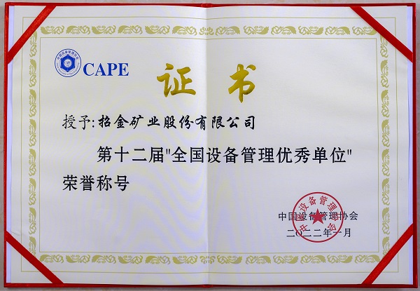 据了解,该奖项是经国家发改委批准,中国设备管理协会组织评选,旨在表彰全国设备管理工作中开拓创新、成效显著的优秀企事业单位,是设备工程领域规格最高、影响最广的奖项。近年来,招金矿业运用设备管理双体系推进成功经验,进一步开展设备分区管理,在改善和规范现场管理,建立设备管理制度、流程、标准,促进设备管理水平提升方面做了大量卓有成效的工作,有力保障了安全生产平稳运行。