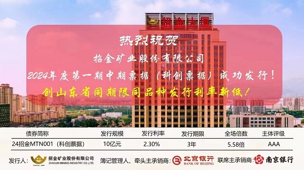 近日,招金矿业持续精准研判市场趋势,抢抓市场发行窗口期,成功发行2024年第一期中期票据,发行规模10亿元,期限3年,票面利率2.3%,创山东省同期限同品种发行利率新低。