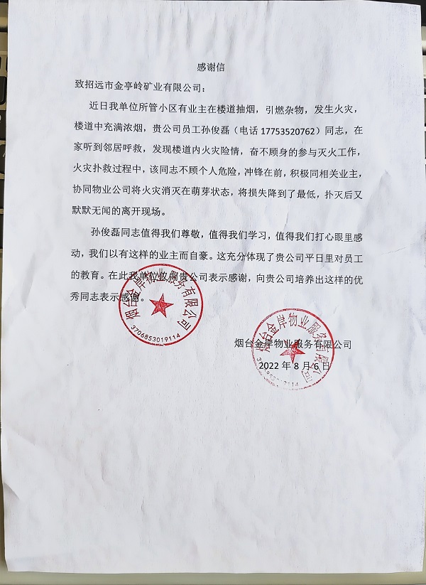 因为孙俊磊对火情处置及时得当,火情在第一时间得到了有效控制,在最短时间内被扑灭,各种损失被降到了最低。事后,他守口如瓶,从未向同事及朋友提及此事,若不是这封感谢信,他会一直“瞒”下去。他说:“我在矿上就兼职应急救护队员,无论是在单位,还是在生活中,遇到这种情况理应冲锋在前。火警响起迎火而上,这是我义不容辞的职责。”