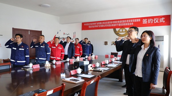 为深入学习贯彻党的二十大精神,以习近平新时代中国特色社会主义思想为指导,进一步加强党组织建设的交流合作,充分发挥好党支部的政治引领、党员的先锋模范作用。近日,招远市金亭岭矿业有限公司党总支携手中国电信股份有限公司烟台分公司纪委办公室党支部在草沟头矿区三楼会议室顺利举行了“党建翼联”共建活动签约仪式。中国电信股份有限公司烟台分公司纪委书记王光,纪委副书记、纪委办党支部书记王超;招远市金亭岭矿业有限公司党总支书记杨少河,党总支副书记尹书妮,副总经理周飞,以及双方党员代表参加本次活动。