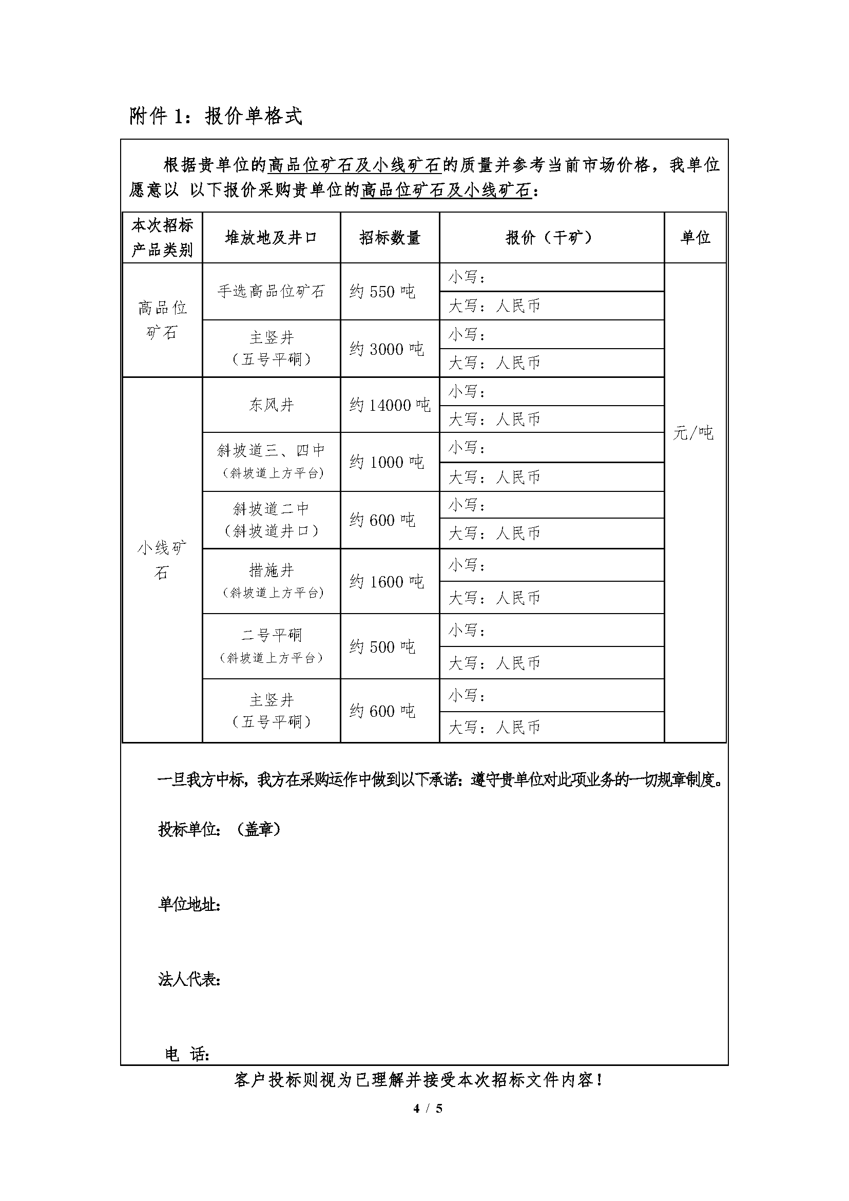 4.如无异议,请投标人将此招标文件和报价单加盖企业公章(或按捺手印)原件扫描后发送至指定投标邮箱;报价单所需填写的数据原则上要求电子版,若手写须大小写注明,如有涂改、不清晰或大小写不一致的视为废标。其他未尽事宜,以中标后签订的合同条款约定为准。