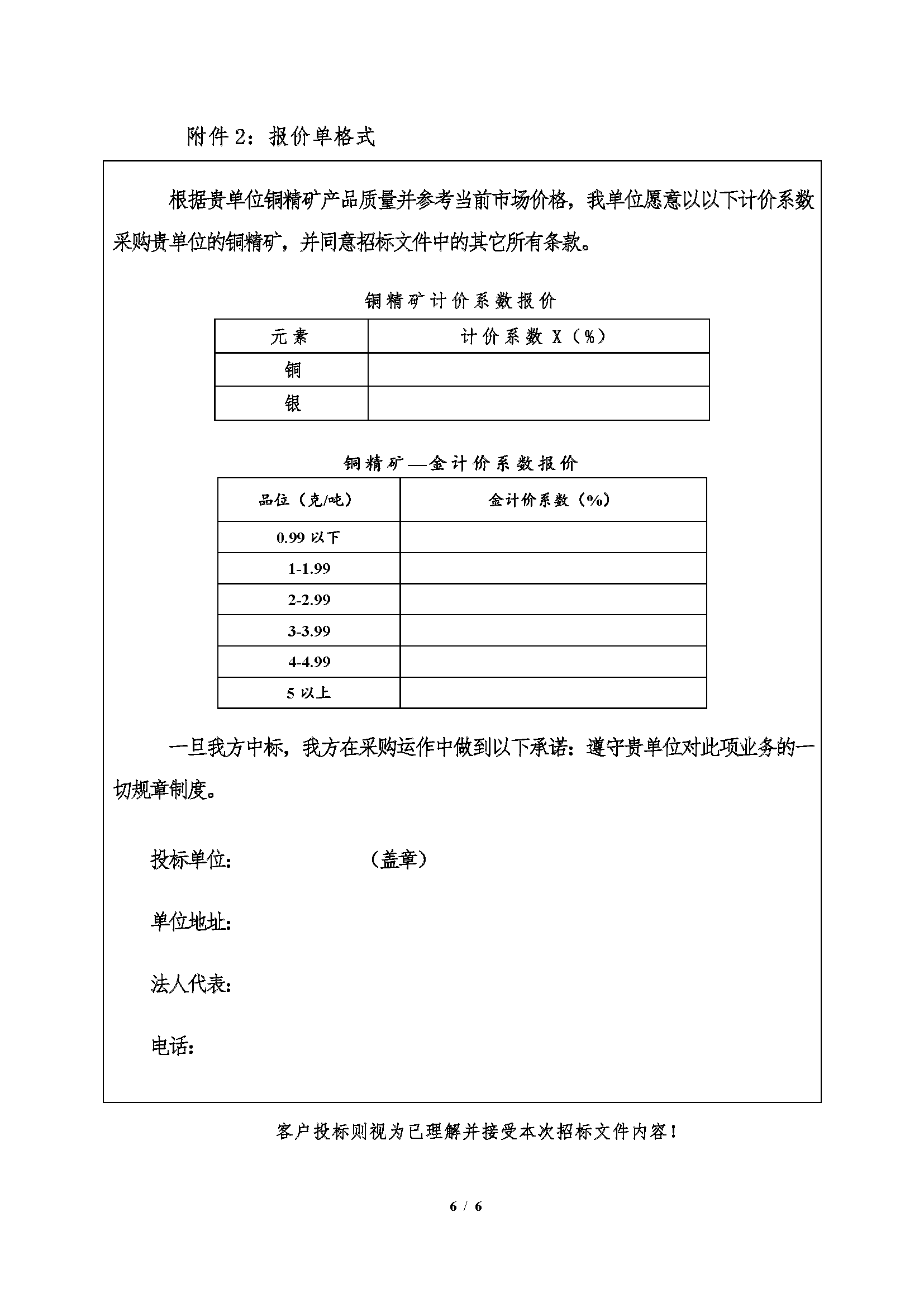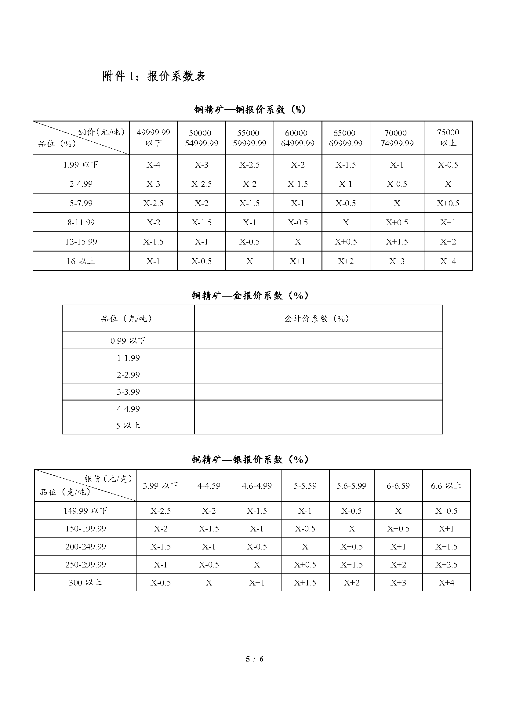 2.本次招标为一次性报价,在标书报送截止后现场制定底标并在规定时间内进行开标。本次招标以我单位检测的本批次矿各元素平均品位对应的报价系数测算出综合单价,每干吨矿计算的价值最高者得。