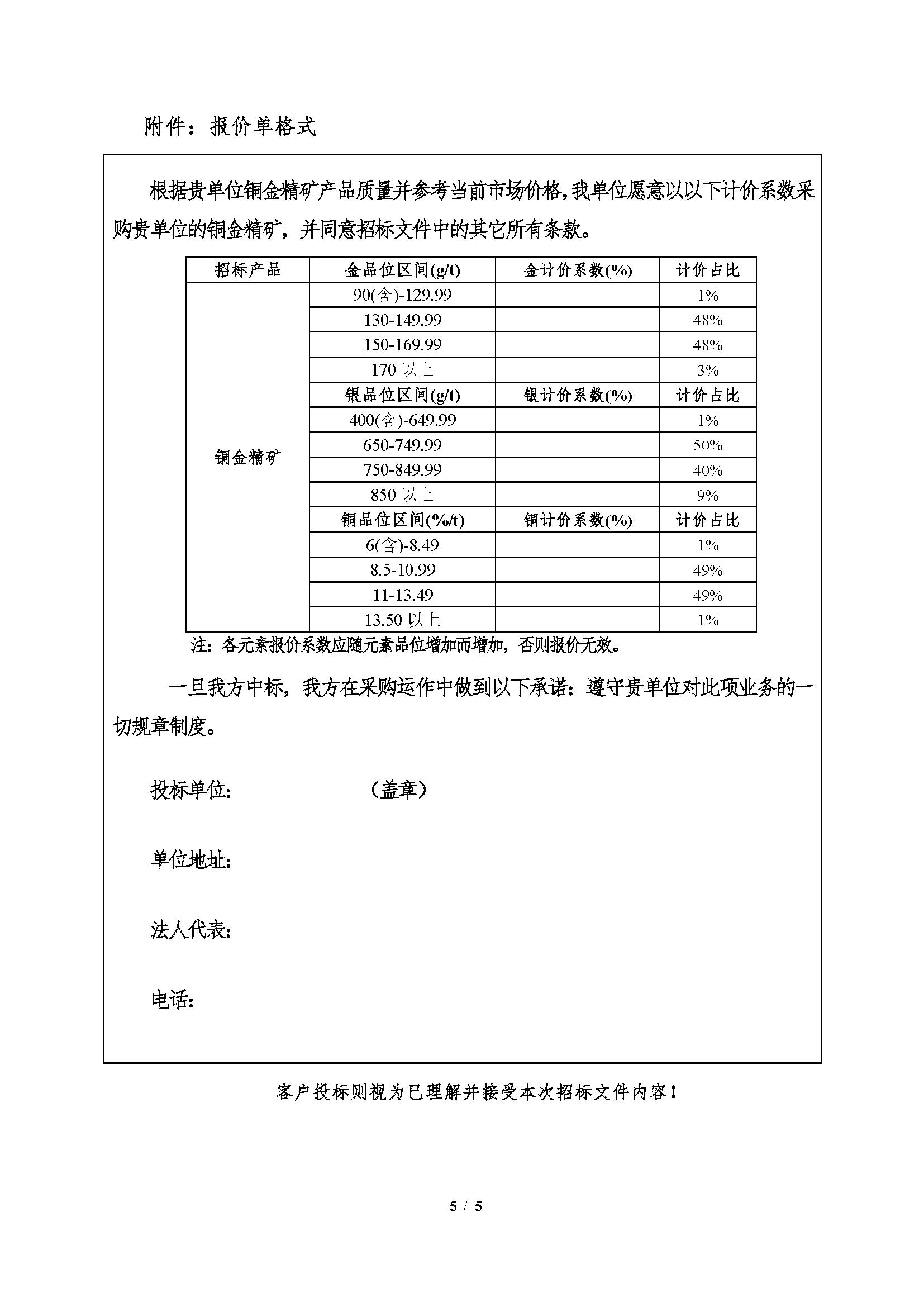 报价测算时金、银、铜的基准品位按照各区间中间值计算,无中间值取边界值(例如90-129.99,取110;170以上,取170),产品报价按吨矿综合价值最高且高于底标的单位中标。报价全部低于底标为流标,开标时符合投标要求的投标人少于三家则为流标;若投标人中标后放弃中标资格的,我公司扣留全额投标保证金,不予退回。