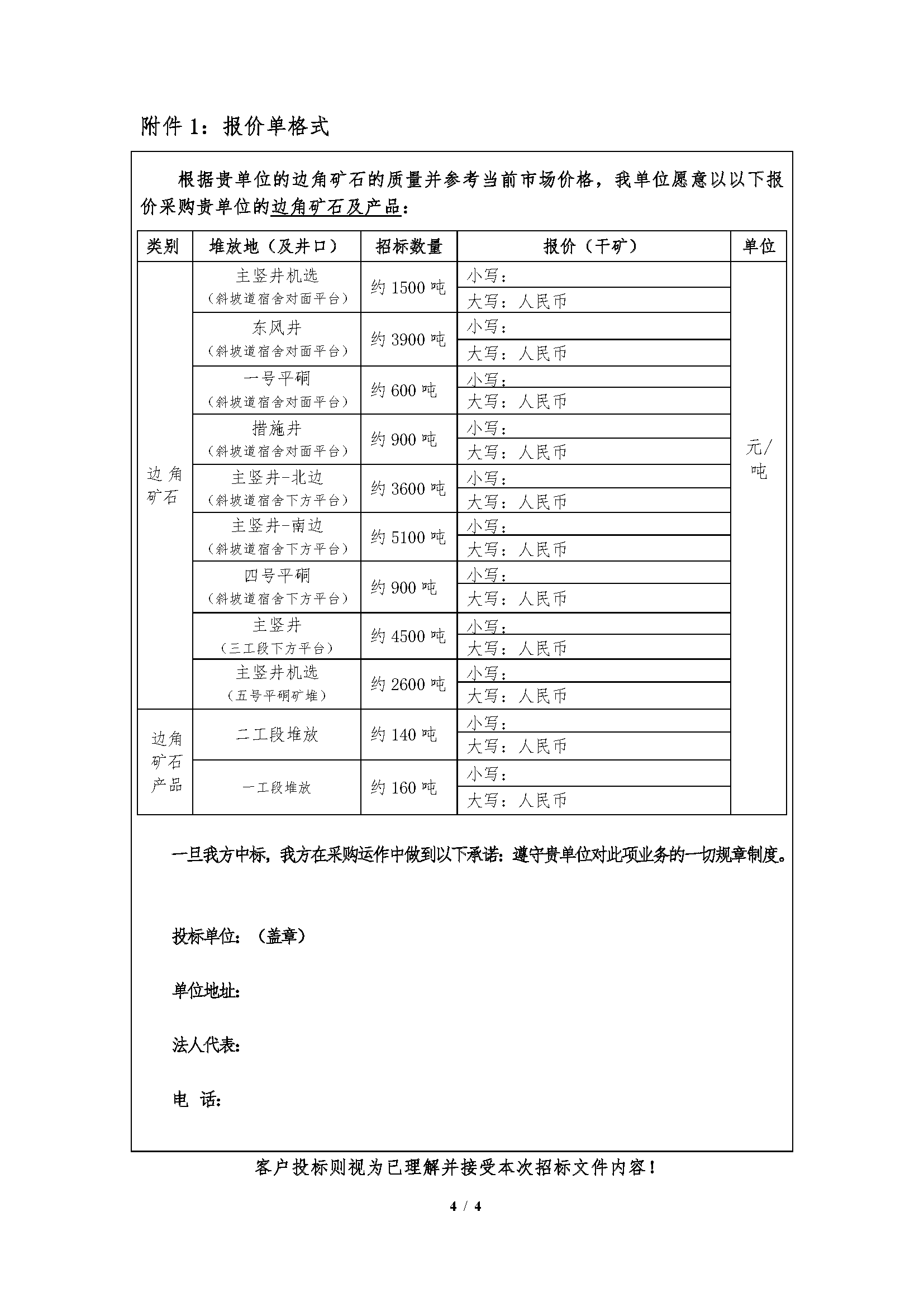 注:本次招标产品数量为预估数,投标按干矿报价,中标结算湿矿以实际过磅数为准,水分按2%扣除计算干矿;边角矿石产品水分由中标人及我公司相关科室、车间人员现场取样、我公司化验的水分数据为准。如中标人需要,我公司开具甘肃省增值税普通发票(黄金)。