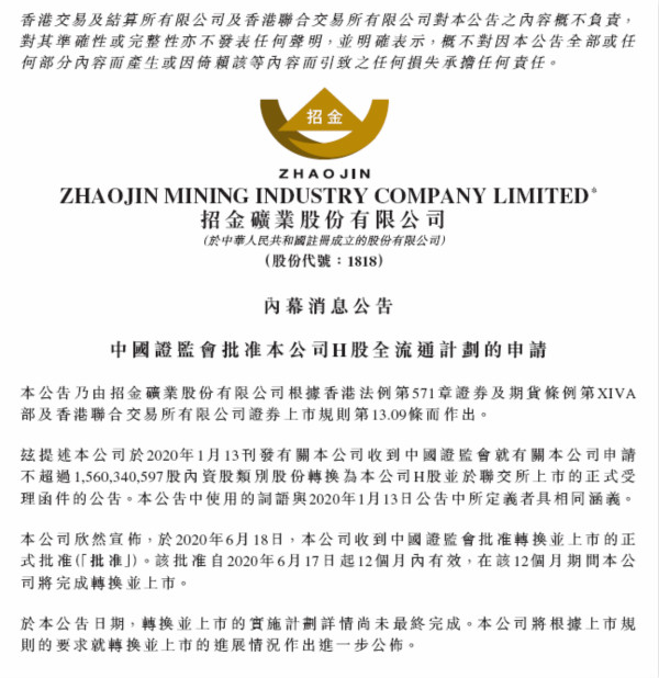 经中国证监会批准,千亿球友会(中国)官方网站于今日正式获得H股“全流通”资格。资格获批意味着招金矿业将有不